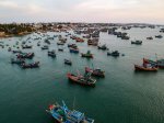 Als wir uns dann unsere Drahtesel geliehen hatten, fanden wir die Polizeikontrolle tatsächlich 2km von der Unterkunft entfernt – so wie unser Host es uns gesagt hatte. Wir hatten uns nämlich über die Polizeikontrollen von Mui Ne informiert, doch war in den meisten Blogs nur von Kontrollen auf dem Weg zu den weißen Sanddünen zu lesen, nicht aber auf dem Weg zu den Roten. Gut, dass unser Host diese Information noch einmal korrigiert hatte. Wir fuhren vorbei an zahlreichen Windsurfern und legten noch einen kurzen Stopp am Meer ein, um die zahlreichen Fischerboote zu sehen, die in der dortigen Bucht angelegt hatten.