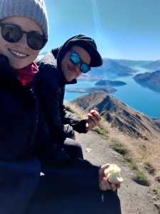 3 Stunden nachdem wir vom Parkplatz aus gestartet waren, genossen wir unser Obst am Gipfel des Roys Peak. Die Aussicht war unschlagbar. Vielleicht das Beste, was wir seit Reisebeginn gesehen hatten. Dieser wundervoll blaue Lake Wanaka in Verbindung mit den umliegenden Bergen des Mount Aspiring National Parks, die gerade den ersten Schnee des Jahres an den Gipfeln erhalten hatten. Traumhaft. Wäre es nicht so lange bis hier hoch gewesen, würden wir hier jeden Tag picknicken. Pumba meinte nur, dass es ihm auch reichen würde, so einen Track alle 3 Tage zu absolvieren.