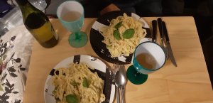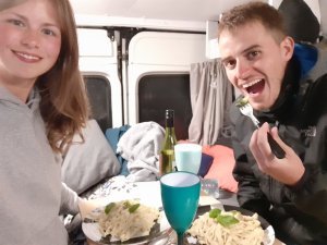 Dann mussten wir für unser wohlverdientes Festmahl noch einmal in den Supermarkt. Wir hatten zwar schon die Nudeln, doch wir hatten uns für eine Sahnesoße mit Lachs und Brokkoli entschieden. Außer den besagten Nudeln fehlten noch alle Zutaten. Nach dem kurzen Einkaufsstopp, wo wir ein tolles Stück Lachs an der Fischtheke ergattern konnten, fuhren wir zurück zu dem einfachen Schotterplatz des Vorabends und begannen zu kochen. Das Essen stellte sich wirklich als das wohl verdiente Festmahl heraus, was wir erhofft hatten. Nur der Weißwein, den wir dabei genießen wollten, war zu süß. Das trübte die Stimmung ums Essen aber keineswegs.